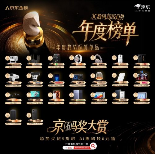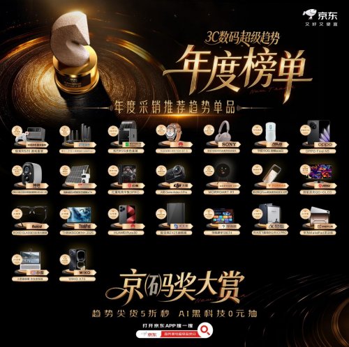 正文:12月24日,京东重磅发布“京码奖大赏·3C数码超级趋势年度榜单”,基于京东金榜海量消费反馈与专业洞察,围绕AI进阶、居家娱乐、户外轻享、智慧起居、创意智造与智能穿戴六大年度趋势场景,甄选出备受用户喜爱与行业认可的趋势好物与品牌。即日起,打开京东APP搜索“趋势潮电”,即可进入“3C数码趋势潮电超级品类日”会场,享趋势尖货5折秒杀、AI装备0元抽等福利,众多上榜趋势爆品同步开启限时秒杀,助你轻松入手心仪潮电。
