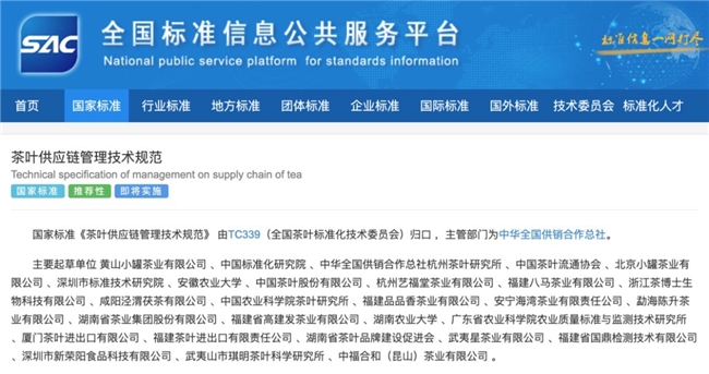 正文:近日,国家市场监督管理总局(国家标准化管理委员会)正式发布《茶叶供应链管理技术规范》国家标准,该标准将于2026年4月1日实施。作为我国茶叶供应链领域的首项国家标准,其发布标志着中国茶产业在供应链标准化、体系化建设方面取得突破性进展。小罐茶作为该标准起草的牵头单位,与众多行业机构、专家、茶企组成标准编制小组,共同制定了这一对茶行业具有历史性影响的供应链国家标准。