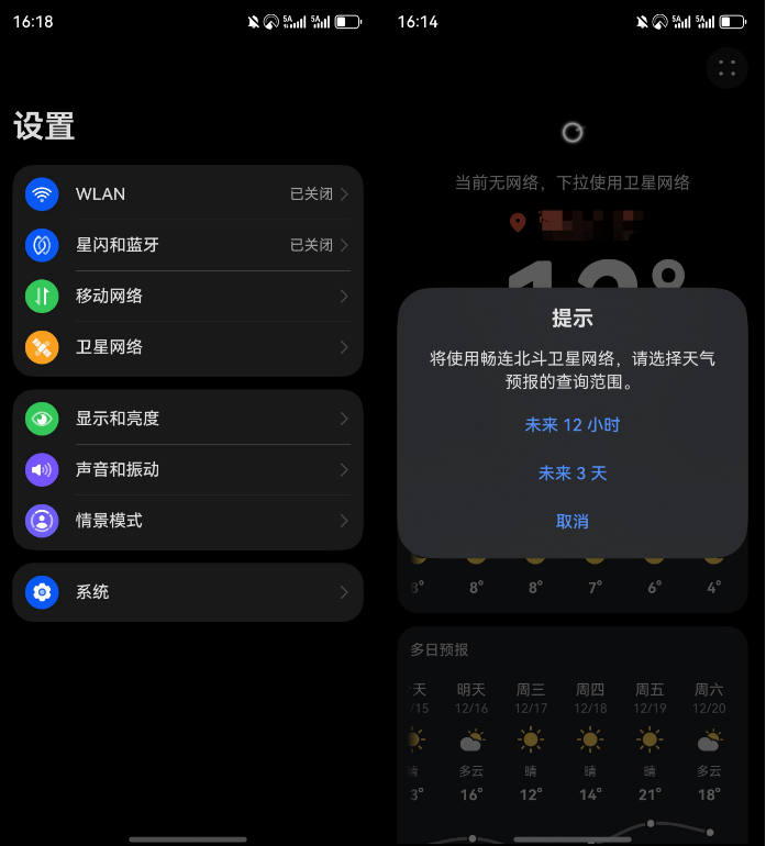 哪怕营地完全没有信号,现在也不用慌。有网络时提前在设置-卫星网络里打开“畅连北斗卫星消息”后,我可以切换到卫星网络模式,能查看未来12小时、最长3天的天气数据。手里有这个户外神器,再也不必担心与世隔绝和天气突变了。