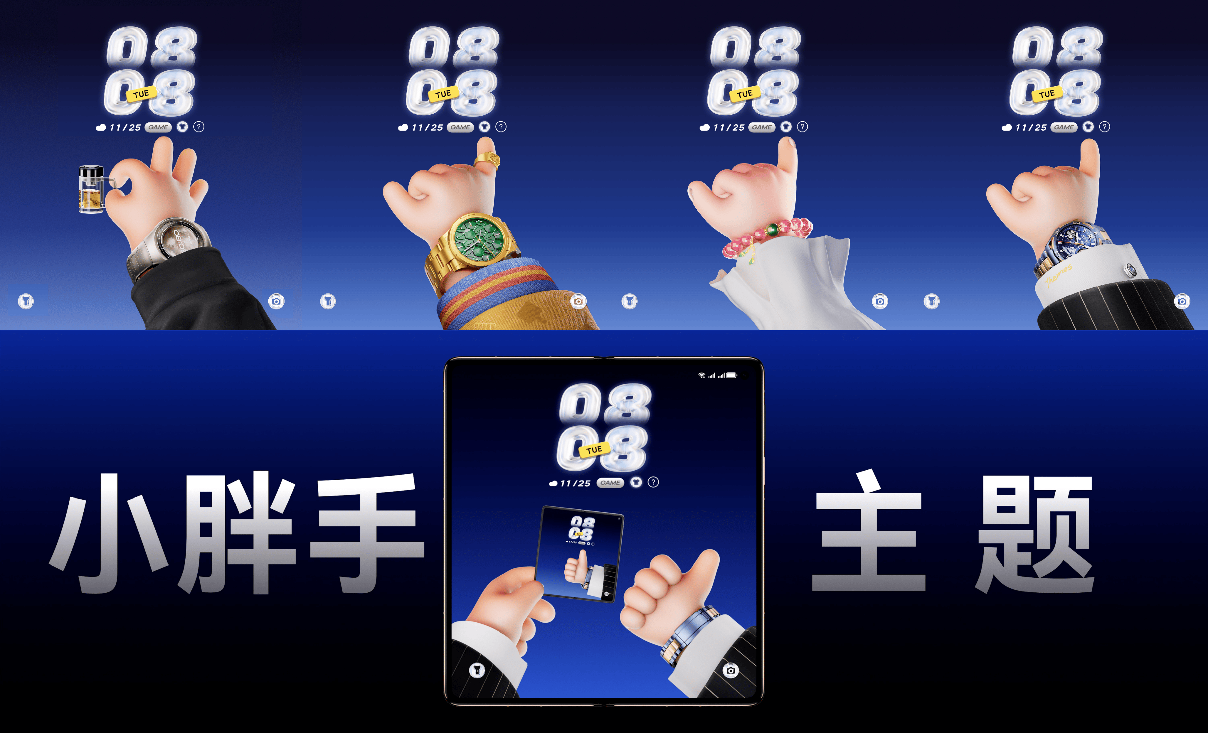 《小胖手 典藏版》以其焕然一新的装饰和趣味十足的互动玩法,成为折叠旗舰Mate X7发布会上一大亮点。区别于此前HarmonyOS 6带来的《小胖手》主题,本次典藏版带来四套全新装扮——沉稳大气的「领导版」、精致干练的「商务版」、炫酷闪耀的「土豪版」 以及配色清新的「水晶版」,充分满足华为终端用户的个性化表达需求。