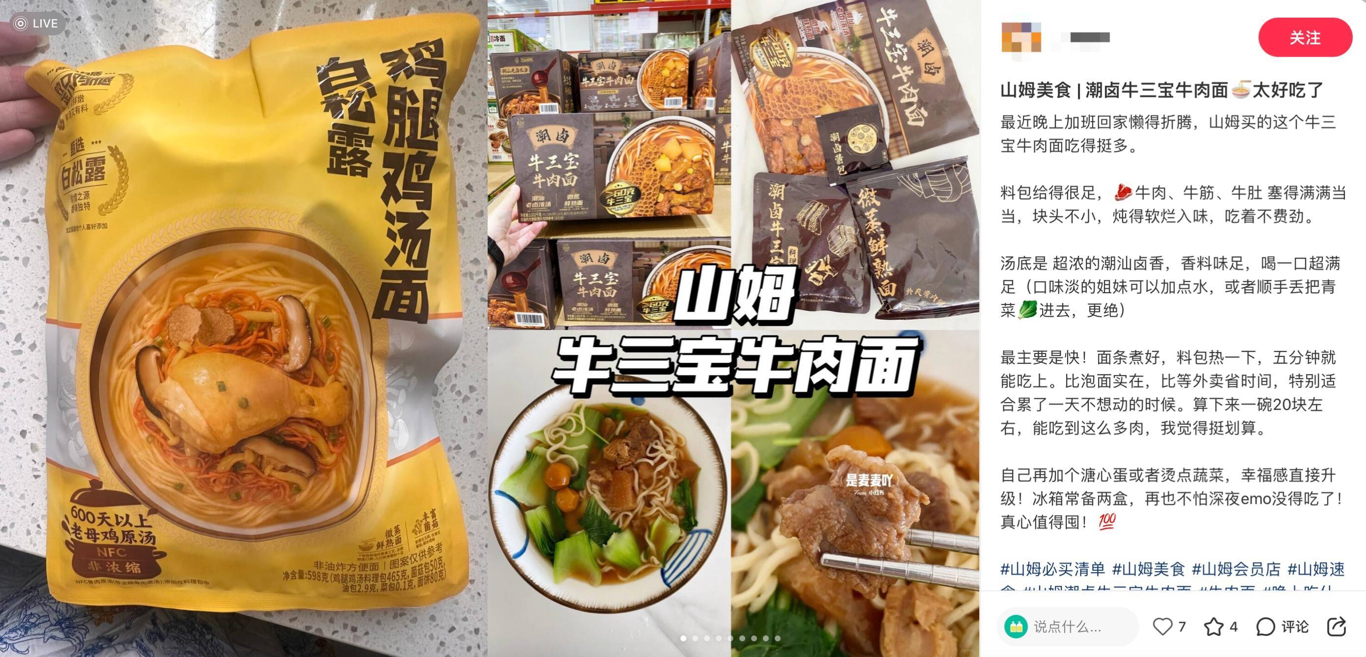 在山姆渠道,康师傅定制了大单品潮卤牛三宝牛肉面、白松露鸡腿鸡汤面。前者内含久卤12小时以上的金钱肚、牛筋、牛腱,用料扎实;后者凭借高端感的调味和稀缺感口味,契合了品质人群的食饮所需。