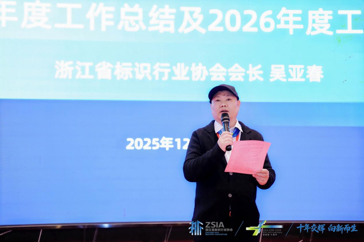 报告中,吴亚春向创会会长徐光明、第二届会长杨跃宇及全体会员单位致以最诚挚的感谢,他强调:“浙江标识行业的十年成就,不是某一个人的功劳,而是全体同仁心往一处想、劲往一处使的结果,这份凝聚力正是行业发展的核心动力。”