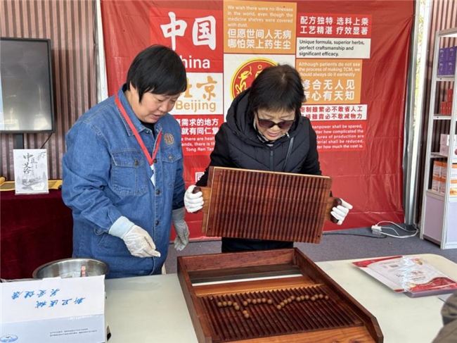 在同仁堂展位上,孔令君和徒弟陈星羽精心准备了蜜丸制作必需工具,向观众全面展示了安宫牛黄丸手工制作流程。