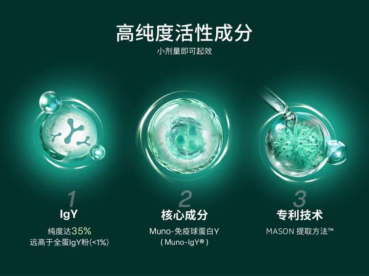 MUNO Therapeutics的技术基石,是自1893年即被科学界所认知的卵黄抗体(IgY)。历经130余年的发展,在免疫防御、肠道健康等领域的学术研究文献已超过600篇,积累了深厚的科学实证基础。与普通食源性补充不同,MUNO Therapeutics的“IGY每日免疫补充”是通过专利纯化技术,从蛋黄中高效提取高纯度活性“免疫球蛋白Y(IgY)”,纯度高达35%,确保了有效成分的足量与高活性。