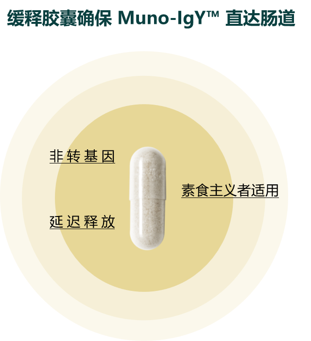 Muno-IgY具有独特的生物特性:分子结构稳定,能够抵抗胃酸和消化酶的降解,以完整活性形式直达肠道;作为一种“被动免疫”成分,它不刺激免疫系统,而是通过其特有的“中和”机制,在肠道内精准识别并包裹特定的潜在有害微生物(如某些大肠杆菌、幽门螺杆菌等),阻止其粘附于肠黏膜,从而有助于减少免疫触发,维护肠道物理与免疫屏障的完整性。这一作用机制,被形象地视为在肠道内增加了一道由“特异性抗体”构成的智能防御网。