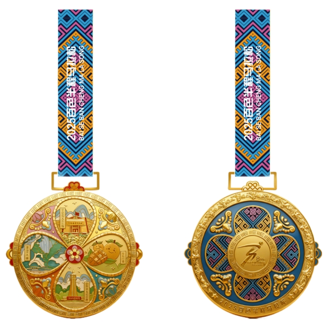 奖牌以红色文化为核心,巧妙融合百色起义纪念馆、壮族浮雕纹饰以及奔跑运动员形象。色彩上以金色为主调,搭配借鉴壮锦美学的多彩带状元素,不仅具有极高的纪念价值,更兼具艺术美感,实现了从赛事纪念到精神载体的华丽升华。