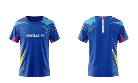 参赛服以“蓝色律动·民族新韵”为核心理念,宝蓝主色呼应百色自然碧水意象。正面“BAISEHM”标识融入城市轮廓,侧边拼接壮乡织锦纹样与红色线条,凸显地域特色;背面赛事信息条搭配格纹装饰,强化专属纪念性;侧边纹样与正面相呼应,既统一视觉,又暗合赛道韵律,兼顾文化感与运动氛围,让跑者在运动中感受独特的文化魅力。