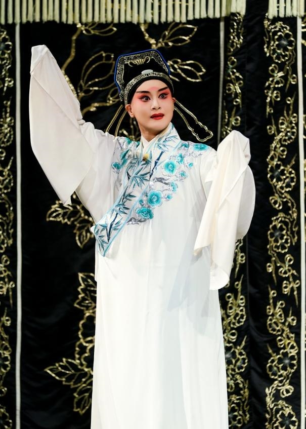 饰演张生的王琛是北方昆曲剧院二级演员,他身上浑然天成的少年气与角色特质高度契合:初见莺莺时,眼神发直、脚步微滞,将“魂牵梦绕”的憨态演绎得惟妙惟肖;修书求援时,提笔疾书的动作里满是“盼救心上人”的焦灼;遭老夫人悔婚后,垂首踯躅的姿态、喑哑却执拗的唱腔,又将书生的痴情与倔强展现得淋漓尽致。