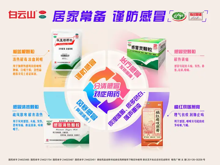 第二是对症支持治疗,缓解痛苦。例如出现鼻塞症状可服用白云山板蓝根颗粒,有研究发现板蓝根颗粒缓解流感所致的鼻塞症状优于奥司他韦组和安慰剂组。出现发热症状,可服用白云山感冒灵颗粒。出现畏寒、流清涕等风寒感冒症状,可服用白云山感冒清热颗粒。咳嗽可根据咳嗽类型使用祛痰或镇咳药物,如使用白云山橘红痰咳煎膏等。