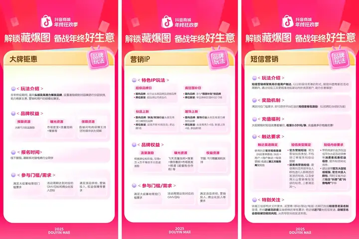 为满足品牌商家在大促期间的多元经营需求,本次年终狂欢季期间推出「品类&上新」玩法;面向处在不同发展阶段品牌,推出「大牌钜惠」、系列「营销IP」、「节盟计划」、「短信营销」以及「千川玩法」等多元玩法,帮助品牌实现生意、营销、用户的规模化增长。