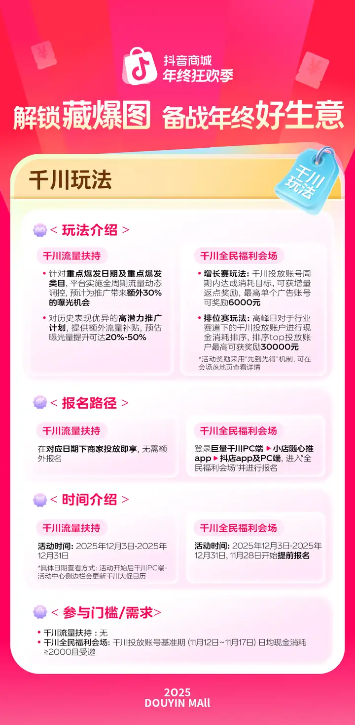 年终大促阶段,品牌商家争 “流” 正酣。不同类目、不同体量的品牌商家都希望借力营销场,带动全域生意增长。为帮助品牌商家扩大声量、助力生意提效增收,本次年终狂欢季推出千川全民福利会场和千川流量扶持玩法,覆盖全品类商家、重点爆发日期与重点爆发类目。商家可根据自身情况参与相关活动,实现曝光有效转化与投放效率持续优化。