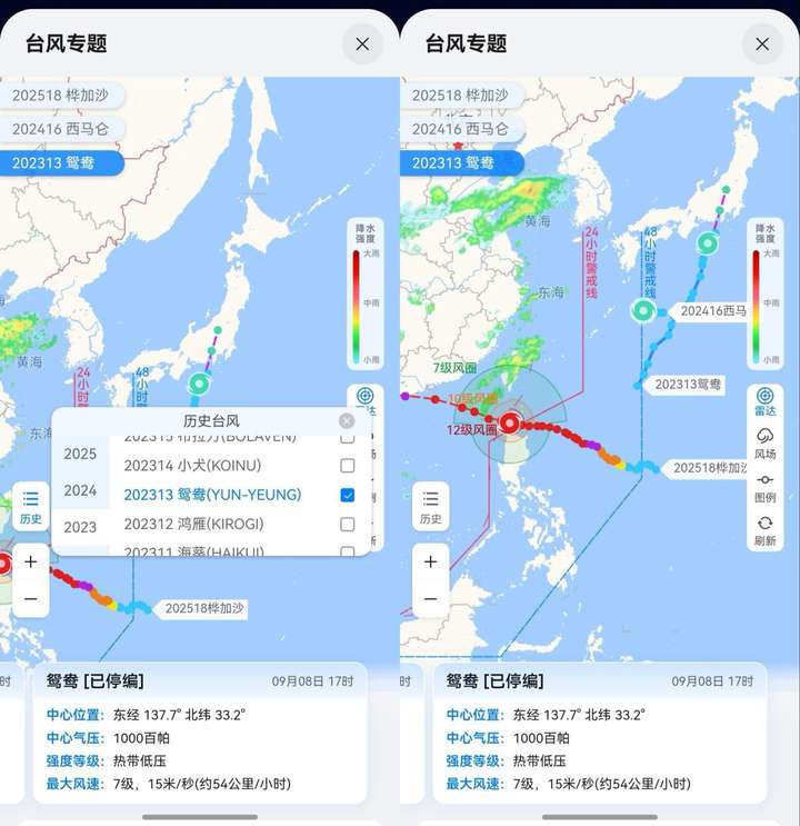 在台风专题中,还能查看历史台风信息,近5年的台风数据清晰准确。我选取了近三年中9月份的台风,从实际来看,今年的“桦加沙”绝对是最近几年最大的台风了,而且行进方向也是往我国沿海城市靠近,并在澳门直接登陆。前两年9月份的台风则远离海岸线,对国内天气并无太大影响。建议沿海地区的朋友提前做好准备,避免被这次的台风打个措手不及!