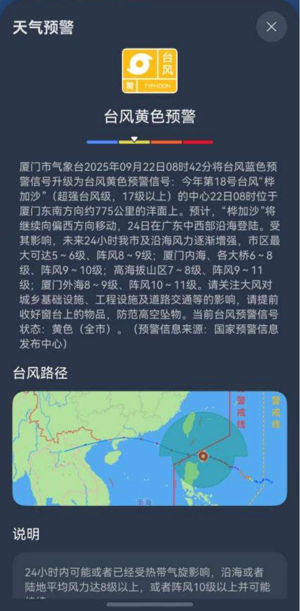 幸好,华为天气的“台风路径卡”成了我的“出游锦囊”。点开台风预警,发现今年第18号台风“桦加沙”预计9月24日将在广东中西部沿海登陆。这次台风达到了17级,属于超强台风级别。虽然登陆以后,强度将逐渐减弱,不过台风路径随时可能会变,我还是得盯着这张卡,方便及时调整旅游线路。