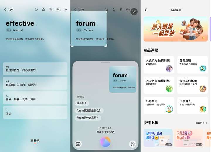 还有一个我珍藏多年的App要分享给学弟学妹们,那就是不背单词App,四六级考试是每个大学生都要面临的“噩梦”,背单词是学英语的基础,这么多年学的都又还给老师了,一到考试两眼黑,我第一次四级考以失败告终,第二次考试总算是过了,全是不背单词的功劳啊!,在背单词的时候能直接把词组搭配、派生词和词根一起学习了,组合记忆更牢固,而且升级鸿蒙5之后,如果想了解关于词汇更多的信息可以直接“圈一圈”,问问小艺,更多答案瞬间出来,我高效学习的秘诀就在这里!新手想快速上手,还有专门的板块来指导大家,非常贴心。
