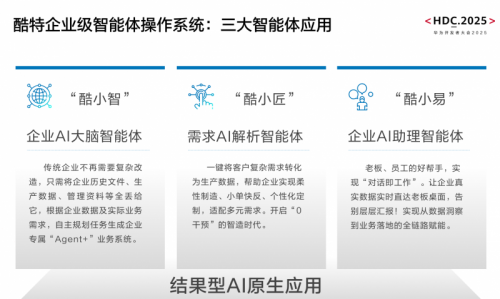 2025年6月,在华为HDC2025开发者大会上,酷特智能发布了“酷小智”“酷小匠”“酷小易”三款全新酷特AI Agent企业级通用智能体应用,为企业打通数智化转型“最后一公里”提供解决方案。