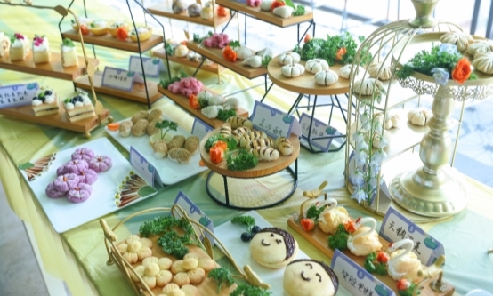 在白案比赛区,则是另一番灵动景象。面点师傅们巧手翻飞,擀面杖在手中流转自如。从考验手上功夫的“饺子巧手赛”,到充满奇思妙想的创意西点,再到展现传统功底的中式面点自选作品,每一件出品都宛如精心打造的艺术品。栩栩如生的小动物造型、缤纷和谐的色泽搭配,背后是师傅们精湛的技艺和对儿童喜好的精准把握。值得一提的是,所有面点鲜艳的色彩均来源于新鲜榨取的果蔬汁,严格遵守不添加合成色素和食品添加剂的郑重承诺,这已成为红黄蓝膳食管理的基石之一。