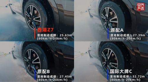 西湖轮胎Z7以25.63米的最短制动距离脱颖而出,显著优于其他三款竞争对手。这一数据意味着,在真实的雨天驾驶场景下,装备西湖Z7轮胎的车辆能更早、更稳地停住,为乘员安全增添了坚实保障。在这项测试中,西湖Z7无疑树立了更高的标杆,展现了其在复杂湿滑路况下从容不迫的操控稳定性和安全保障能力。