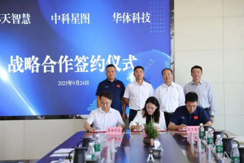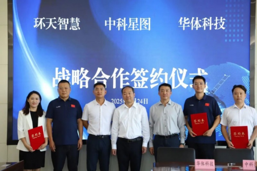2025年9月24日,中科星图、华体科技与环天智慧战略合作签约仪式在眉山兴产集团顺利举行。中科星图党委书记兼总裁邵宗有、高级副总裁兼星图测控董事长胡煜、副总裁兼星图智慧高级副总裁陈君颖,华体科技董事长兼总裁梁熹、董事长助理兼投资总监张辉、低空事业部总经理文江涛,眉山兴产集团副总经理李川,环天智慧总经理陆汪、副总经理杨振宇等核心团队出席仪式,共同见证行业协同发展的重要时刻。