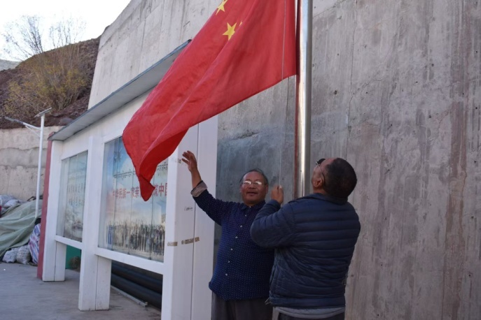 作为爱国主义教育的一种形式,达吉论珠常年主持村支部的升国旗仪式。(照片由本人提供)