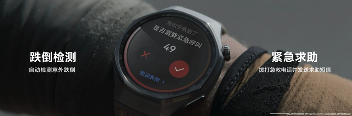 (*跌倒检测紧急联络需要提前设置好紧急联络人,要求手表与手机保持蓝牙连接,并需配合 HarmonyOS 2、Android 8.0、iOS 13.0 及以上版本的手机,并安装华为运动健康 app 使用。配合搭载 HarmonyOS 5 的手机使用时,需手机HOTA 升级至 HarmonyOS 5.1.0.230及以上版本才可支持,请以实际使用情况为准。)