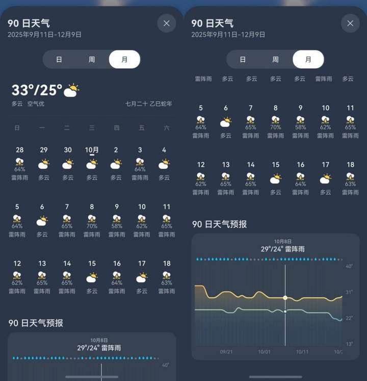 这次去三亚,我最期待的就是出海游玩,晴天、阴天景色差很多,碰上大雨天更别想出海了。华为天气有个很实用的功能——90日天气预报功能,让我能提前就看到三亚的天气走势。目前来看,十一期间三亚有4天会下雷阵雨,3天是在假期结尾的5号、7号和8号。我果断调整行程,将假期前四天安排为出海和景点游玩,下雨时就在酒店享受悠闲时光。这样既能体验海岛出海游,又能感受酒店的轻松氛围。提前订好机票和酒店,还享受了一波提前预订的折扣!