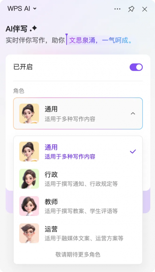 徐奕成表示,针对传统AI写作“文风僵硬、内容脱离实际、修改成本高”的痛点,WPS AI 伴写融合通义大模型,通过“多角色适配”与“深度意图识别”技术,让AI真正“读懂”用户。WPS AI伴写已提供通用、行政、教师、运营四种不同身份,伴写会根据对应身份,思考后生成内容,由此减少人类在写作上的重复劳动,进而专注创作“独特内容”和“关键信息”。