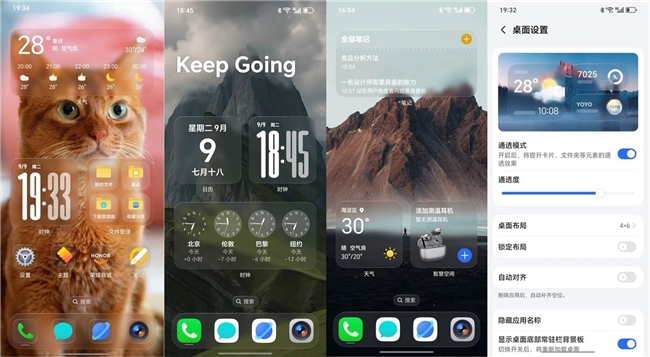 首先,最引人注目的变化来自视觉层面的全面焕新。荣耀MagicOS 10首次引入“通透模式”设计,通过高透玻璃质感的界面元素、悬浮式卡片与图标,营造出轻盈、舒适、有呼吸感的视觉体验。通透效果元素可适配所有壁纸,并支持用户根据个人喜好自定义调节透明度。同时,系统文字锐度也经过专项优化,对比iOS26及MagicOS 9,在保留通透质感的同时,确保关键信息清晰易读,美感与实用性兼具。