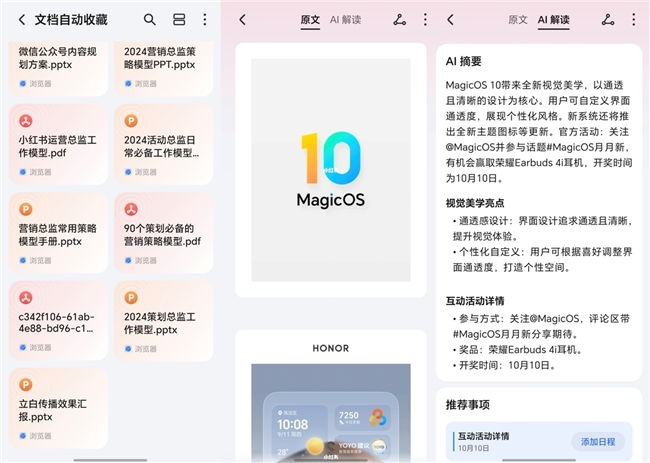 据内测用户在公共领域的讨论,升级至MagicOS 10后,系统新增十余项AI功能。其中作为专属个人知识库的 “YOYO记忆”的升级尤为亮眼。升级后的YOYO记忆在原有收藏空间基础上,支持“随心记”、“安心管”、“贴心用”,化身更全能的随身助理,帮助用户提升信息存储、编辑、管理效率。
