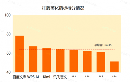 排版美化方面,报告认为受试的8款产品具备图文排版、图片生成等功能,基本可保持全篇格风格一致,平均得分为64.35分。报告特别提到,WPS AIPPT等产品在PPT中配色、文字搭配方面较为协调,排名第二位,成绩领先平均分。