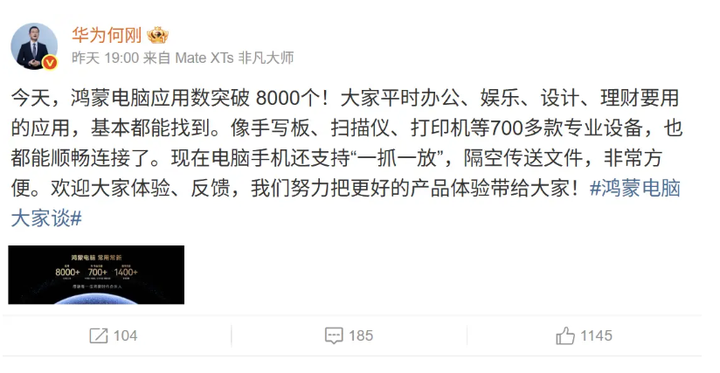 开源鸿蒙外设生态也实现突破,并已在鸿蒙电脑上规模商用。目前已支持20多个种类的1500多种标准外设(键盘、鼠标、显示器等)、700余款通过鸿蒙电脑兼容测试认证的非标准外设,吸引40多家头部外设厂商加入适配。欢迎更多外设厂商积极送测认证,共同完善开源鸿蒙外设生态。