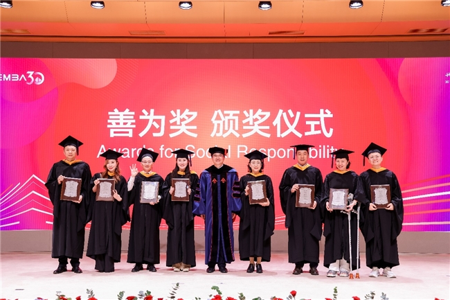 致辞环节后,汪泓院长和濮方可副院长颁发优秀毕业生奖。张维炯教授、王泰元教授颁发善为奖。毕业之际,感恩母校是一种传承,EMBA全体毕业班均参与了毕业捐赠,马磊书记及萧斌老师为班级代表颁发了捐赠证书。
