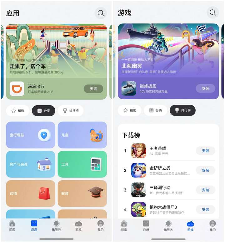 体验路径:打开AppGallery,在“应用”或“游戏”页,点击腰部的“分类”或“排行榜”查看