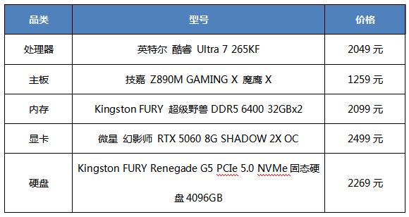英特尔 酷睿Ultra 7 265KF处理器拥有8大核12小核20线程,大核频率3.9-5.5GHz,小核频率3.3-4.6GHz,二级缓存36MB,三级缓存30MB。主板选择了技嘉 Z890M GAMING X 魔鹰X,这款主板采用8+1+2供电模组,支持最大256GB DDR5内存,甚至可以支持8800+MT/s速度内存,3组M.2插槽,其中1组还支持PCIe 5.0x4模式,未来升级无忧!