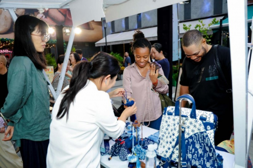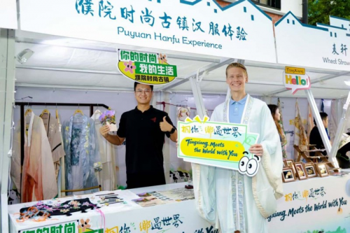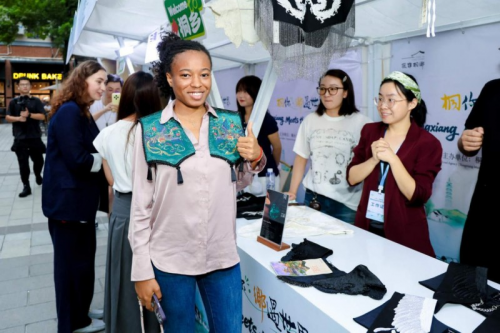 活动现场还设置了风雅桐乡文创市集。南秀丝语丝绸制品、蓝印花布等文创产品以及麦秆画、喜糕、蓝印花布、核雕、漆扇等非遗手作,吸引了众多海外游客驻足采购、体验。