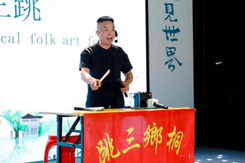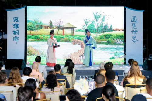 活动现场,非遗文化的古韵与现代审美的活力交织共鸣。桐乡花鼓戏经典选段《庵堂相会·过桥》娓娓上演,拉开活动序幕。文雅细腻的身段、活泼明快的唱腔,将传统曲艺的“Chinese Style”演绎得淋漓尽致。随后,浙江省非物质文化遗产、桐乡传统民间曲艺“桐乡三跳”登台亮相,三片竹板轻击,清脆声响里流淌着江南乡音,让现场中外嘉宾在丝竹声中读懂江南文化的独特韵味。