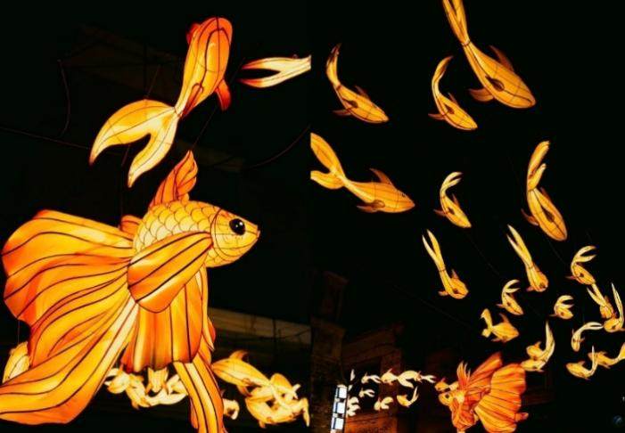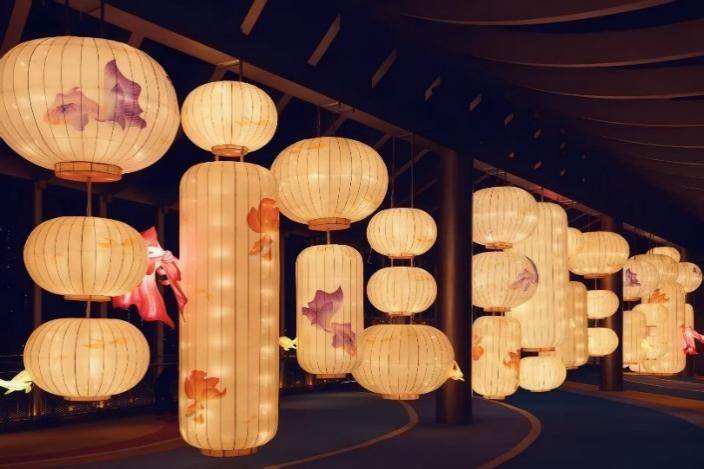 “非遗鱼灯漫巡”(上)与“鱼灯渡”(下)主题彩灯装置亮相K11 ECOAST