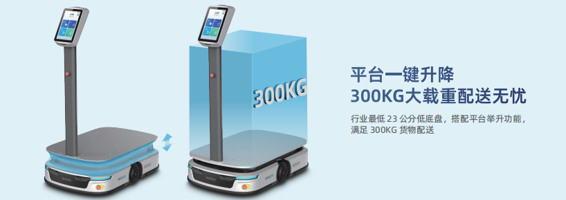 该机器人拥有300kg大载重能力,采用超低底盘设计与一键升降平台,可轻松适配各类货架。