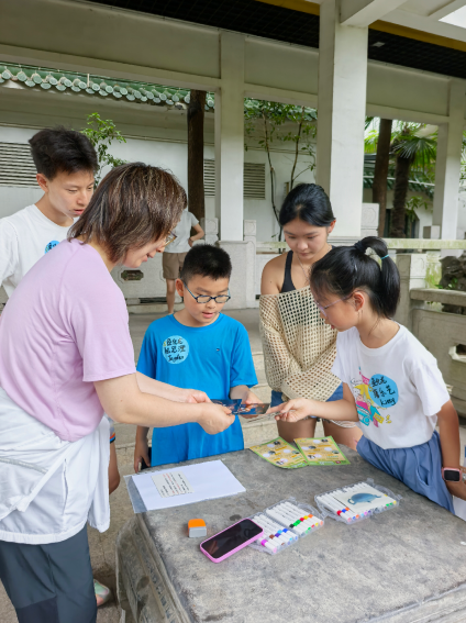 “供春壶”、“石瓢壶”等五支以名壶命名的青少年队伍,穿梭于古树茶亭间。任务不再是枯燥的知识灌输:在陆羽茶亭挑战“凤凰三点头”茶艺并拍照打卡、在回廊拼出紫砂壶制作工序、吟诵紫砂诗词、集体创作紫砂传承口号...每个点都像一个“文化盲盒”,等待用脚步和协作去解锁。细雨浇不灭热情,欢呼声此起彼伏。敲下的任务印章,是通关的证明,更是文化认同悄然加深的印记。“我们完成啦!”的欢呼,宣告了这场创新实验的成功。
