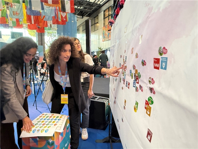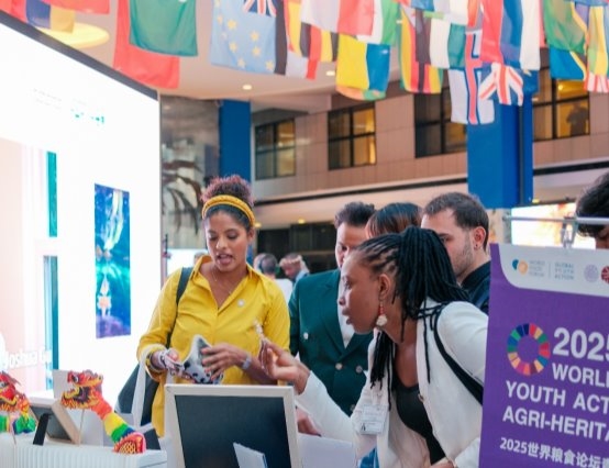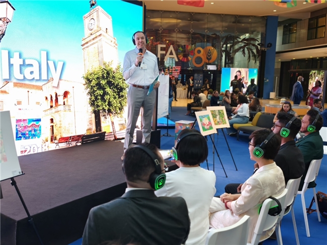 10月16日,“一山一水一世界”儿童画国际巡展,在联合国粮食及农业组织总部罗马旗帜大厅举办了以Better generation为主题的系列公益活动,与来自全球的嘉宾分享画展走过十年98场公益活动、同时展播了儿童画AI动画片和21个国家650幅儿童画作品。两位小朋友表演了“包装袋再利用儿童秀”、世界各地小画家代表通过视频分享了他们对可续发展的理解,嘉宾们在地图上找到自己家乡用儿童画贴纸描绘了一幅“可持续发展的画卷”。活动现场设立非遗专题展区,清华大学乡村振兴工作站三创中心和清华大学唐仲英学生全球发展中心带来了十余支来自清华大学“乡创+”教学项目创业团队的创新成果。