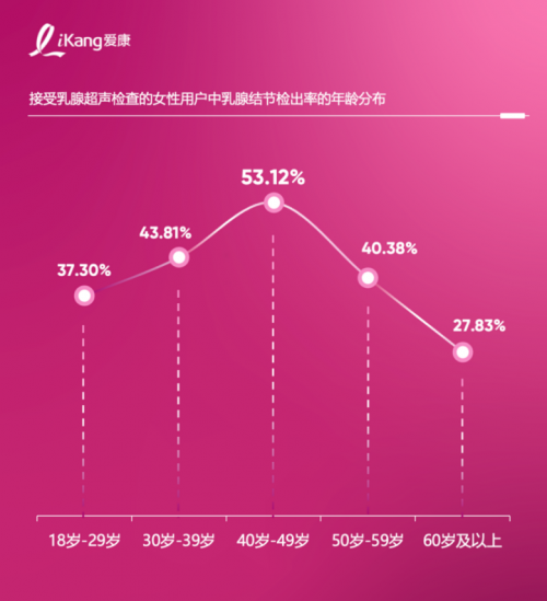 随着年龄的增长,乳腺结节的检出率呈现先升后降趋势。其中,上有老下有小的40岁-49岁女性,成为检出率最高的年龄段,高达53.12%,可能与这一年龄阶段女性体内激素水平的显著波动有关。