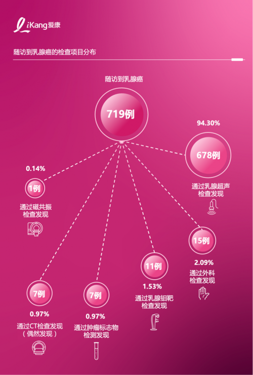 乳腺结节的普遍性反映出女性乳腺健康形势的严峻。尽管大多数乳腺结节属于良性病变,但仍有1%-2%可能发展为乳腺癌②。粉红报告显示,在298.38万位的女性体检人群中,爱康集团已随访到乳腺癌719例,后续随访工作仍在进行中,预计会有更多确诊病例被发现。