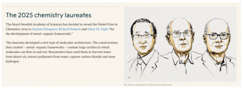 瑞典皇家科学院于 10 月 8 日宣布,将 2025 年诺贝尔化学奖授予三位科学家:北川进(Susumu Kitagawa)、理查德·罗布森(Richard Robson)和奥马尔·M·亚吉(Omar M. Yaghi),以表彰其在金属有机框架(Metal–Organic Frameworks, MOFs)开发方面的杰出贡献。