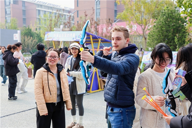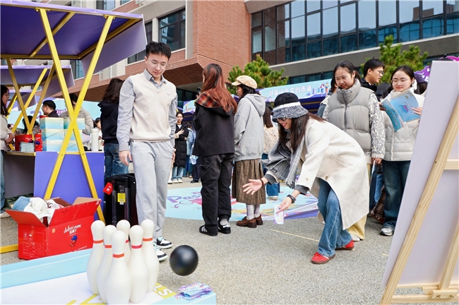 “一鲁狂镖”“齐鲁保龄球汇”“好客山东飞盘局”等互动游戏区域人气火爆,成为学生近距离感受山东文化的重要窗口。同学们在轻松竞技中增进了对山东旅游的认知与向往,现场排队参与热情高涨。随着“给山东一首歌的时间”快闪表演开场,现场氛围被推向高潮,演出嘉宾的精彩表现为活动再添热度。