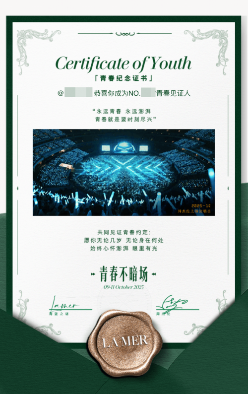 此外,海蓝之谜在“独家青春挚礼”的周边创意中,植入“专属青春证书”创意互动,激发UGC多次裂变破圈,让品牌主张转化为可持续的社交资产,在裂变传播中塑造千万人的品牌印记。