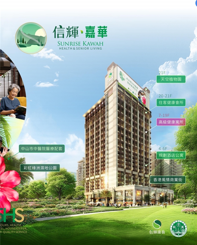 因“金座·活力城”的成功打造和广受香港长者的欢迎。信辉康养与嘉华实业顺应时代发展步伐,强强联手,以双方的优质资源共同打造中山又一“六星级港人SCCRC康养社区”。新项目紧靠中山市区唯一一间可以使用香港医疗券的中山市中医院和彩虹绿洲湿地公园旁,楼下为沿河香港风情街区,楼上设有高质量康养公寓、健康管理会所、空中植物园等高端康养配套。