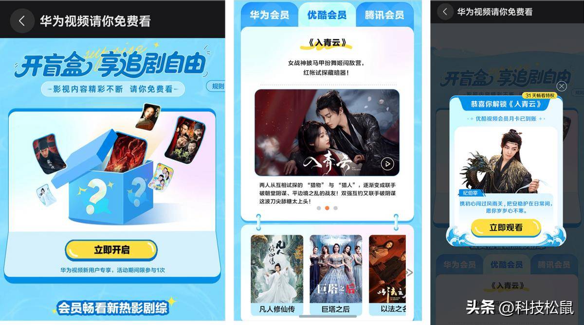 最近华为视频还推出了一个盲盒片单活动,紧跟当下“盲盒潮流”。只需要对华为小艺说“我要追剧自由”,就能开盲盒免费随机领取华为影视、优酷和腾讯的视频会员,喜欢追剧和观影的朋友千万不要错过。我抽到了优酷视频会员月卡,打算开始追“古风小生”侯明昊主演的《入青云》,接下来我和女友又有“下饭菜”了。