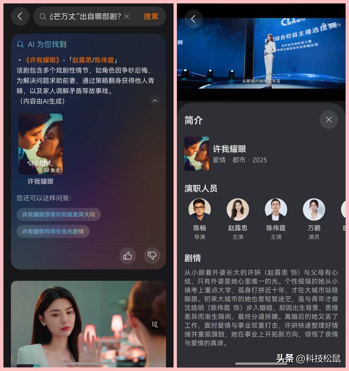 说到和我女友一起追《许我耀眼》,还是从一句台词开始的,女友在短视频平台刷到一个视频,台词“许我耀眼,许你光芒万丈”吸引了她,就问我这句台词出自那部剧?聪明的我打开华为视频,直接搜索“许我耀眼,许你光芒万丈”出自哪部剧?AI经过短暂思考后,就找到了相应的影片为《许我耀眼》,后来就有了我们一起追《许我耀眼》这件事。