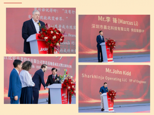 Versuni Netherlands BV、深圳市晨北科技有限公司、SharkNinja Operating LLC、SELECT BRANDS INC.客户代表也为比依送上祝福,他们表示与比依合作多年,已建立深厚的友谊,对其实力表示肯定,同样期待与比依智能制造基地深化合作,共同探索智能家电的新兴领域,以更高效、更环保的产品服务全球市场。
