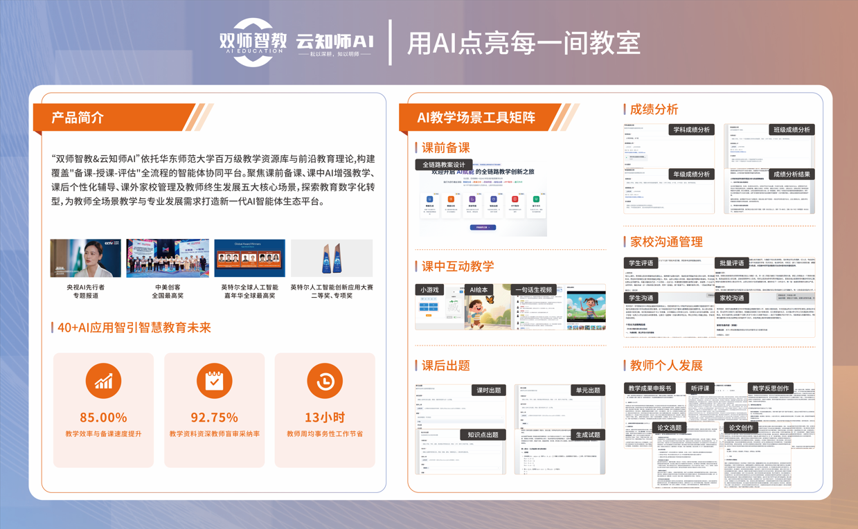 云知师AI以“用AI点亮每一间教室”为愿景,依托华东师范大学百万级教学资源库与新的教育理论,构建覆盖“备课-授课-评估-发展”全流程的智能体协同平台。其核心突破在于对课前备课、课中AI增强教学、课后个性化辅导、课外家校管理、教师终身发展五大场景的闭环支持。目前,云知师AI平台已集成40余项AI应用,覆盖80%的备课与教学工作外延场景,教师幸福感提升达75%,成为推动教学效率与质量双提升的关键引擎。