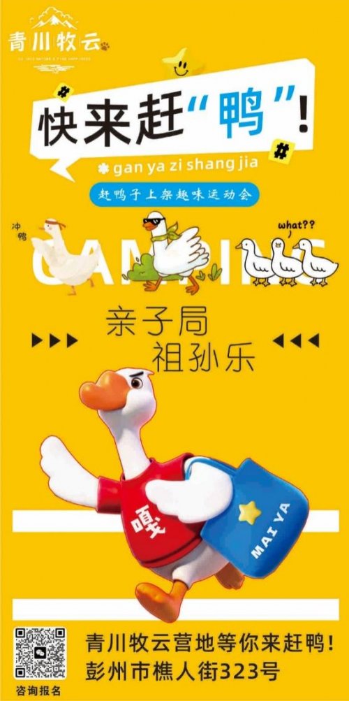 据营地负责人透露,青川牧云营地未来将持续推出特色活动,将自然野趣与创意玩法深度融合。即将在近期推出的“赶鸭子上架”趣味大赛(真正的鸭子,真正的赶!),旨在为家庭与朋友们提供一个运动、协作且充满欢笑的独特体验,再次诠释其“亲子亲宠”的快乐理念。